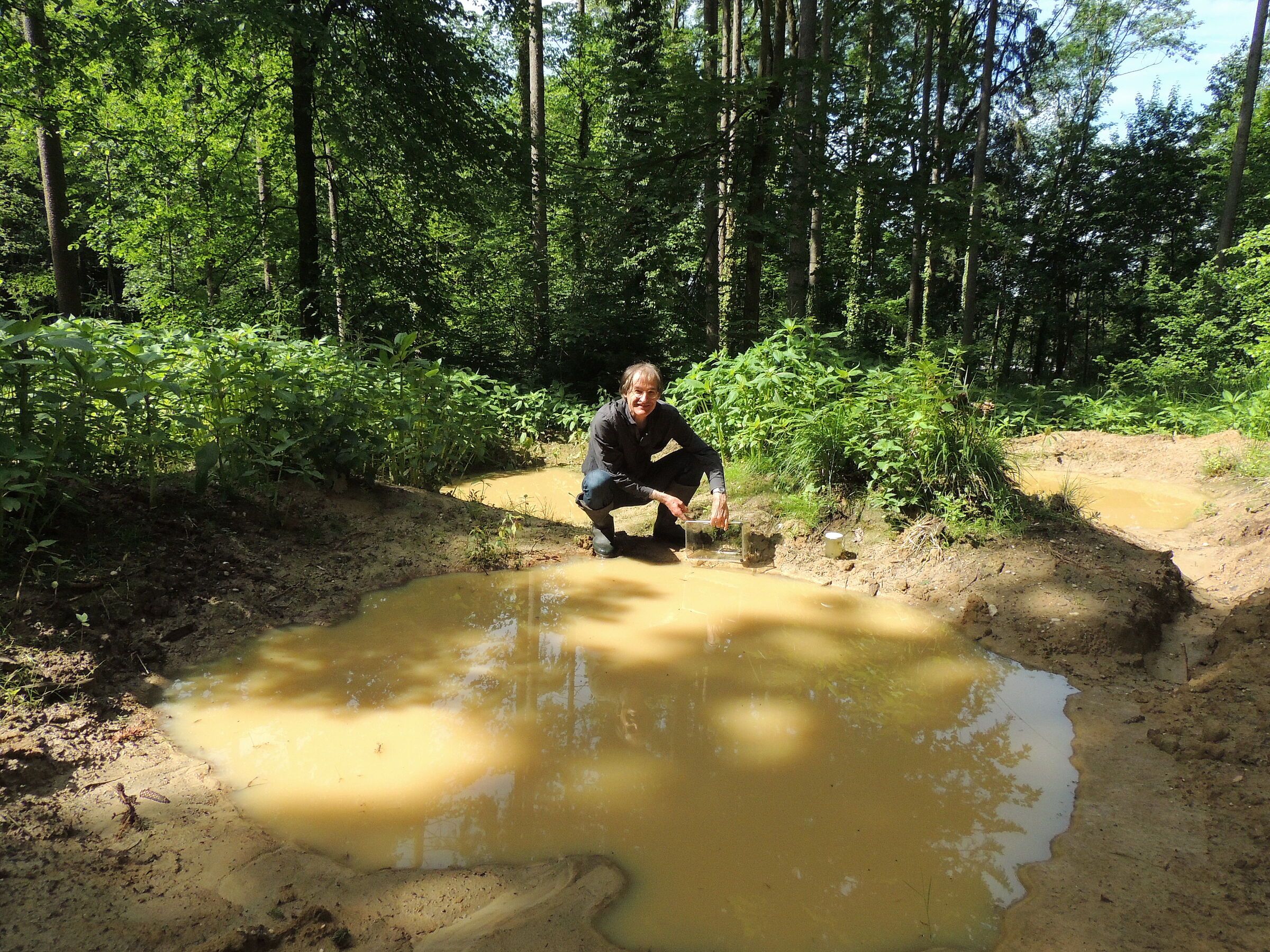 Die neu gebaggerten Tümpel in dem quelligem Klinikhang bieten gute Voraussetzungen für einen neuen Unkenlebensraum. BN-Geschäftsführer Manfred Drobny entlies am 29. Mai dreißig kleine Gelbbauchunken in ihre neue Heimat, in Absprache mit den Behörden.