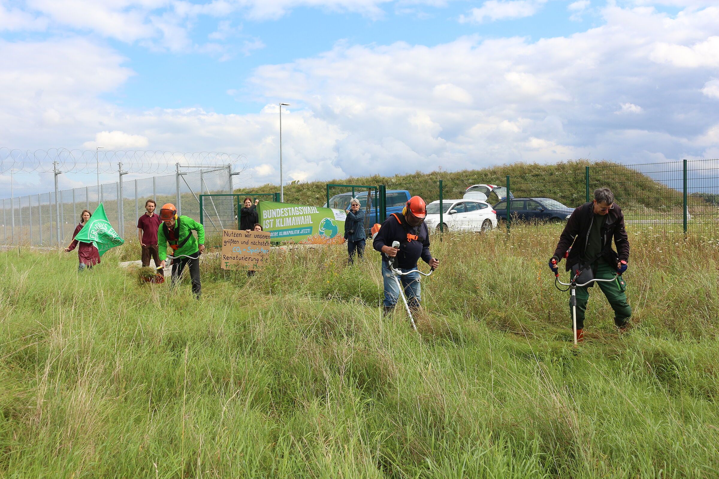 Am Freitag, den 27.8., 15:00 Uhr trafen sich Vertreter der BUND Naturschutz-Kreisgruppen Erding und Freising und den Freisinger Fridays for Future (FFFF), ausgestattet mit Motorsensen, Gabeln und Rechen um trotz Beton und Flugverkehr dieses kleine Stück Natur zu erhalten. Tatsächlich leben dort noch bemerkenswerte Tiere wie die „Hausmutter“, ein großer Nachtfalter oder Bachstelzen. Mäht man die Fläche nicht, verfilzt die Fläche, viele typische Wiesenarten verschwinden.