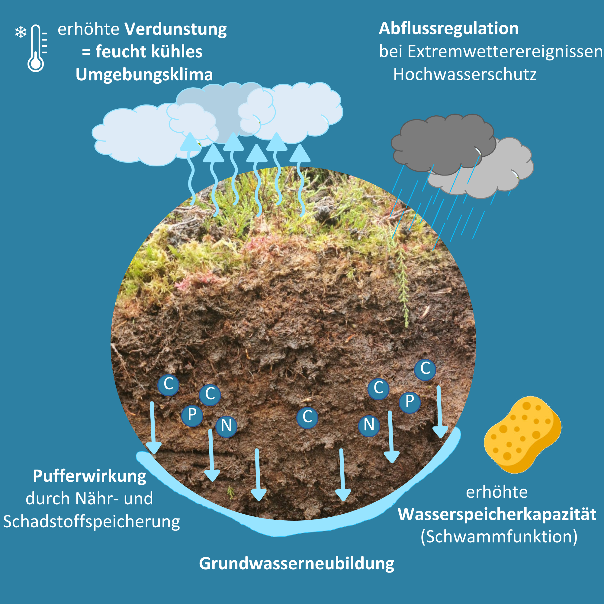 - Wasser wird gespeichertes Wasser und langsam an die Umgebung abgegeben. Das ist besonders in Trockenperioden wichtig.